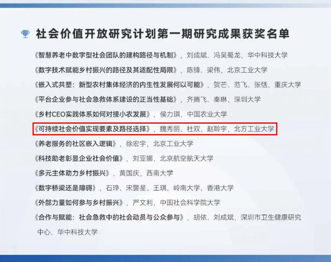 此次获奖不仅是对经管学院魏秀丽副教授团队研究成果的认可,也是对pp电子官方网站在社会责任和可持续发展研究领域实力的肯定,为推动企业可持续社会价值生态的构建贡献了北方工大的智慧和力量。