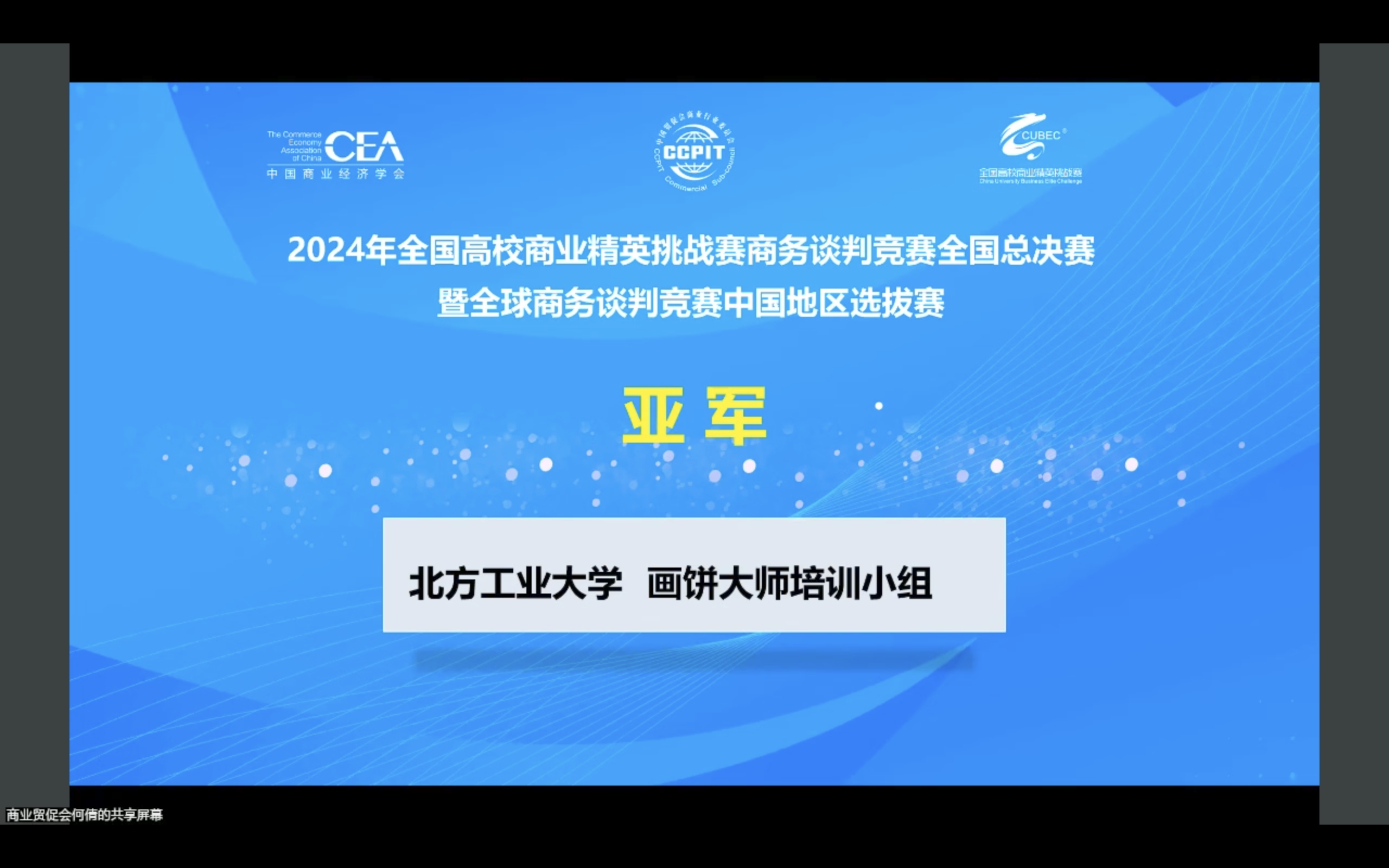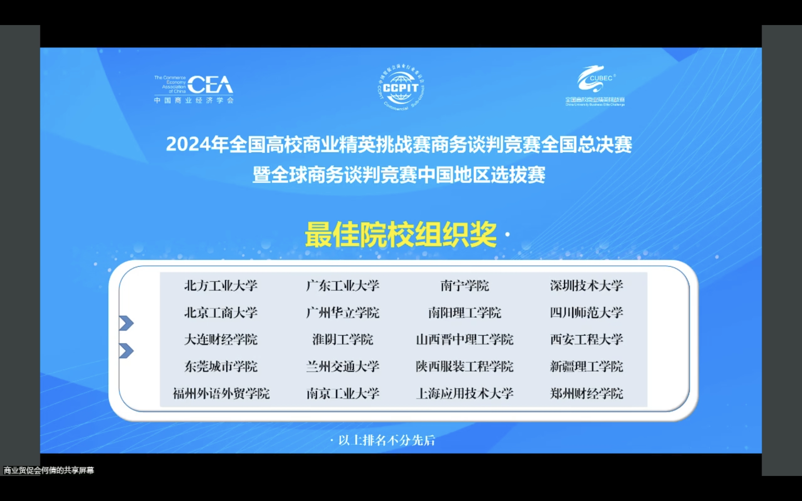 11月3日,2024年全国高校商业精英挑战赛商务谈判竞赛暨全球商务谈判竞赛中国地区选拔赛在线上圆满落幕。我校在总决赛中获得一等奖5项,二等奖2项,三等奖1项,最佳院校组织奖,其中合作共赢队和画饼大师培训小组获得本次竞赛的冠军和亚军。