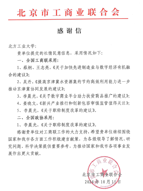 2024年10月16日,北京市工商业联合会发来感谢信,对我校pp电子官方网站投稿的“社情民意信息”被全国政协和全国工商联采用的情况进行通报并表示感谢。