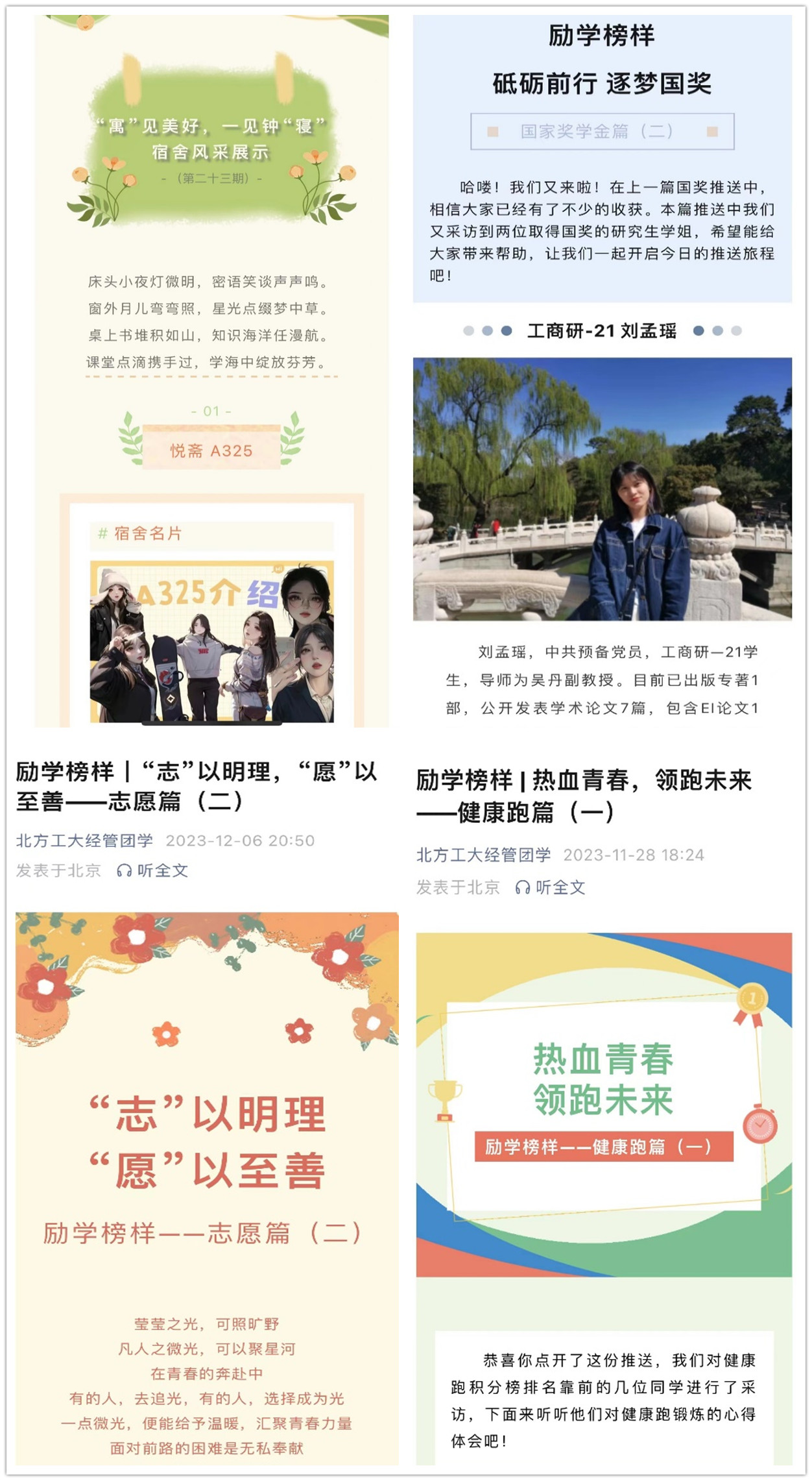 学院建立榜样带动机制,采用线下线上相结合的方式。开展优秀学习笔记评选活动,开展“最强班级”、“最美宿舍”培育评选,推出“‘寓’见经管”宿舍风采展示,选树学风优良、环境整洁的宿舍典型。开展健康跑、奖学金、志愿服务、保研等“励学榜样”先进事迹宣传,选树先进个人典型,营造团结互助、创优争先、见贤思齐的良好学风。通过树榜样,立标杆,培育一个典型,辐射一批学生。此外,紧抓毕业、考研、期末考试等关键节点,明确学生需求导向,组织优秀朋辈资源,围绕出国留学、保研、考研、期末考试等主题,开展“励学畅谈”系列经验分享活动,端正学风。