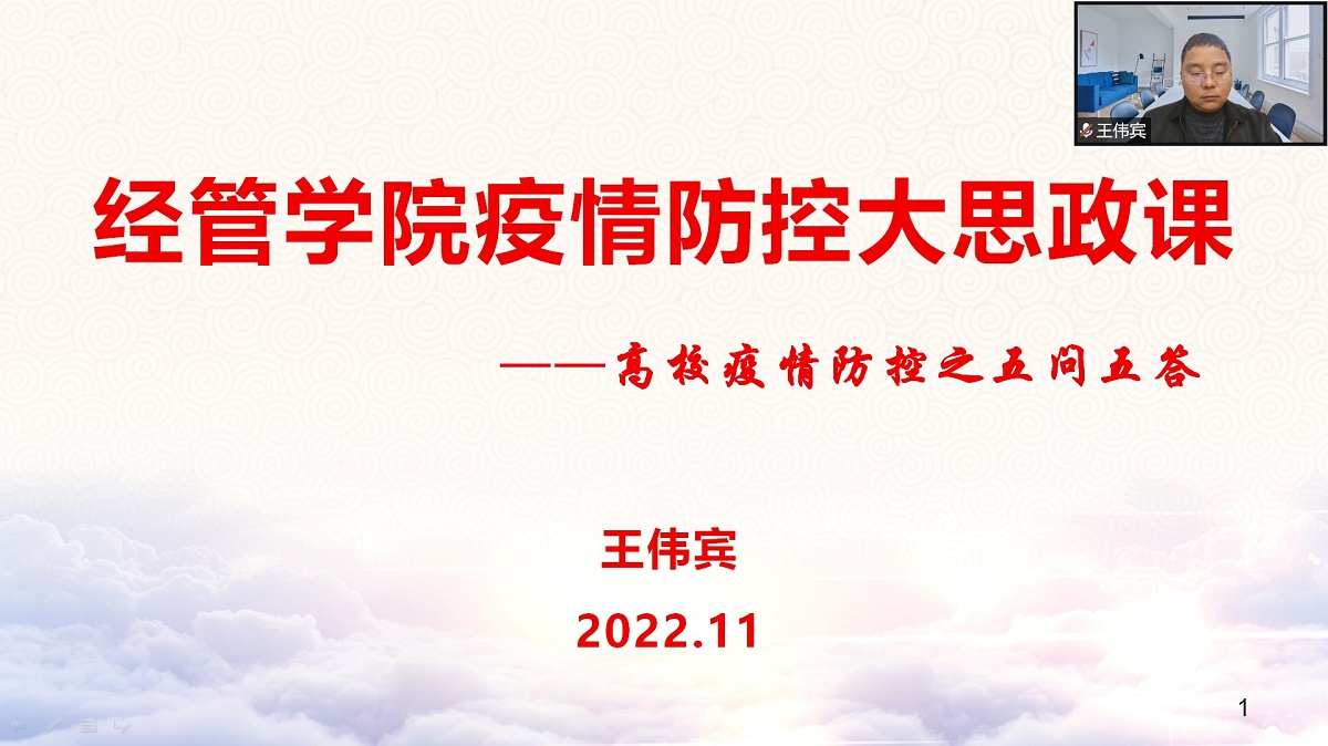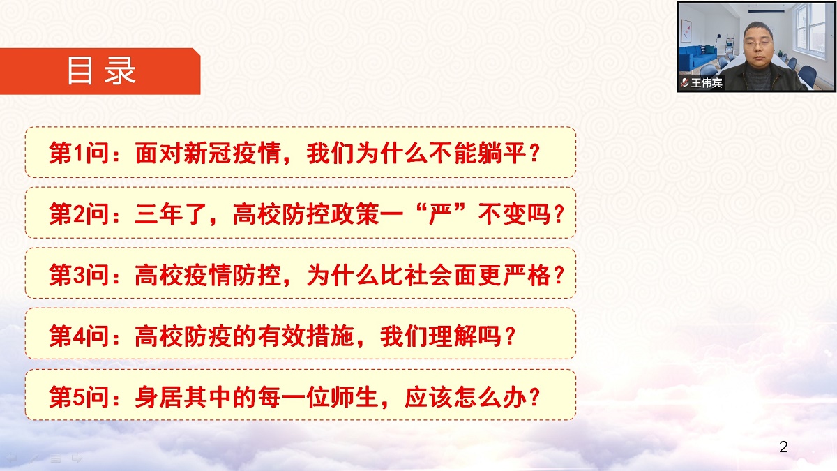 为进一步落实主体责任,重点加强风险管理,坚决守护校园安全,11月30日,pp电子官方网站党委书记王伟宾通过线上的方式对班子成员、系主任、支部书记开展了“高校疫情防控之五问五答”专题大思政课。