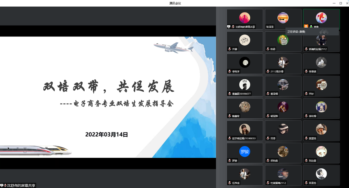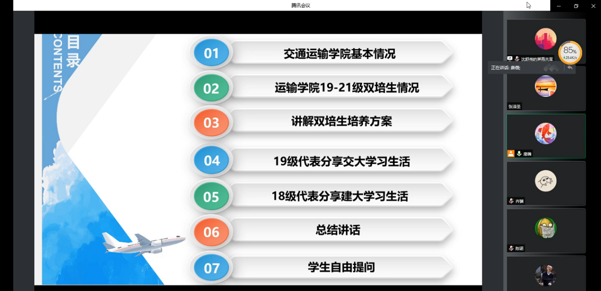 会上,唐薇主任介绍交通运输学院发展沿革、专业设置、本科生培养以及19-21级双培生在校期间的学习生活就业等情况,pp电子官方网站党委副书记赵洁老师在课程学习、疫情防控等方面对学生做出指导,经管学院副院长陶晓波老师解读了新修订的双培生培养方案,18级、19级双培生代表分享在交大的学习生活。会议最后的提问环节,各位参会老师对学生比较关心的学分认定、课程替换、考研等问题进行解答。最后,唐薇主任进行总结,鼓励所有同学珍惜北交大、北方工大两个平台资源,继续为自身和学校发展贡献力量。