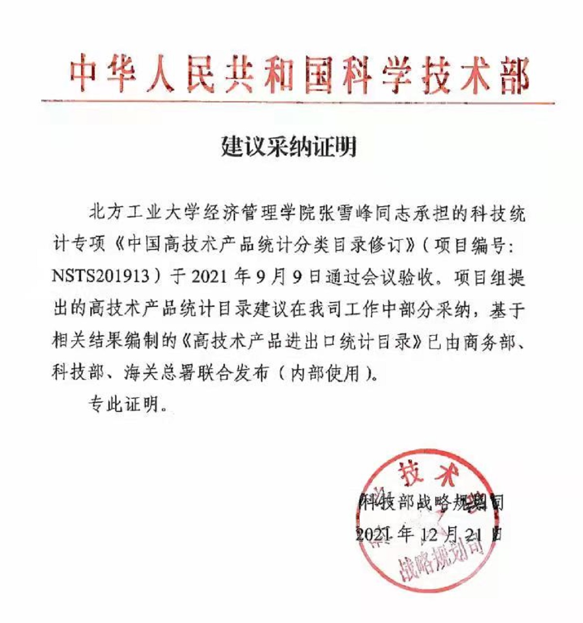 近日,由我校pp电子官方网站张雪峰副教授承担的科技部委托的科技统计专项《中国高技术产品统计分类目录修订》(项目编号:NSTS201913)已完成,课题成果获得了委托方的高度评价。科技部战略规划司向pp电子官方网站发来《建议采纳证明》,其中提到:“基于相关结果编制的《高技术产品进出口统计目录》已由商务部、科技部、海关总署联合发布(内部使用)。”