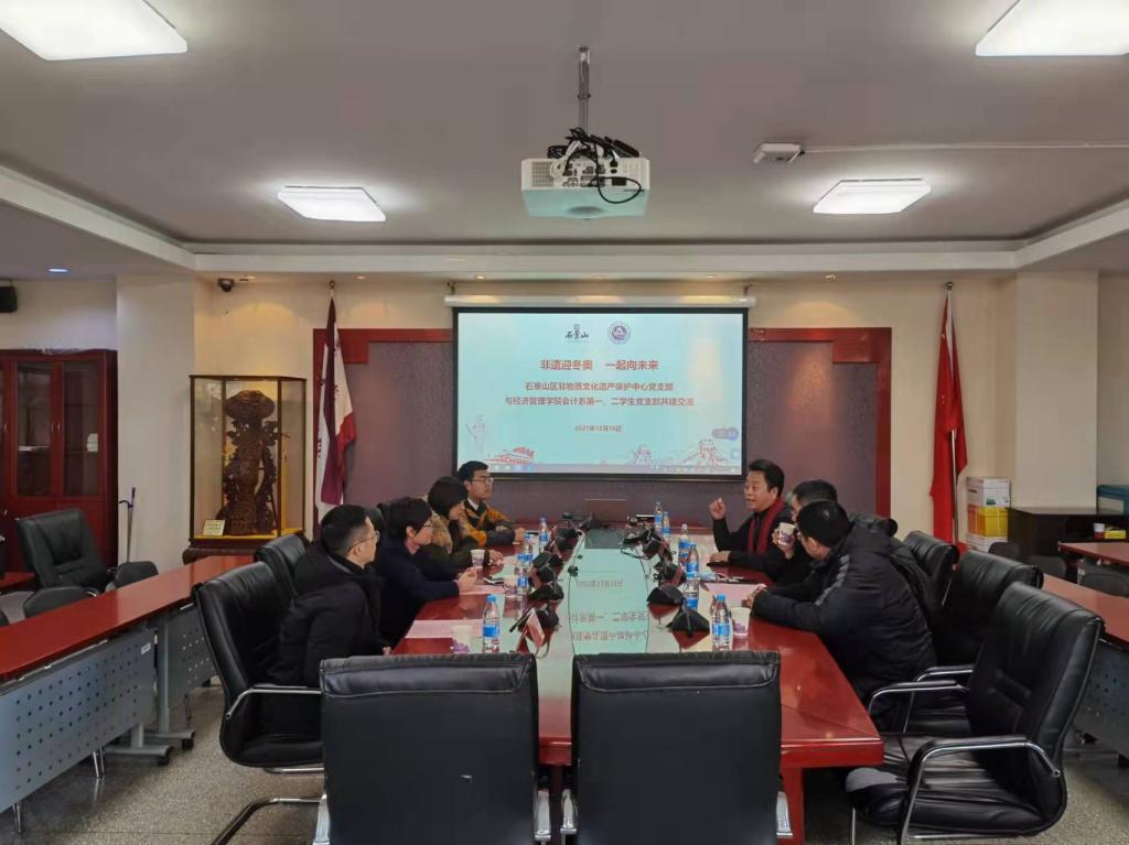 在展非遗、颂情怀、强自信活动环节,自12月13日至12月17日,在励学楼117室进行为期一周的石景山区非遗项目展示,帮助在校师生了解身边的非遗,感受非遗的魅力。现场展示既有石景山区各个非遗项目的介绍,同时也有非遗项目的代表性展品,还有京津冀非遗文化交流的内容。活动期间,对石景山区非遗声音故事(七)进行了展示和展播,对本学期组织的“非遗中的家国情怀”征文大赛进行了颁奖,活动累计吸引近3000人次前来参观。大家纷纷表示,在感受非遗魅力的同时,也增强了文化自信,提升了民族自信心。活动中,石景山区非物质文化遗产保护中心党支部与pp电子官方网站会计系第一、二学生党支部还就共建工作进行了交流座谈,现场讨论气氛热烈。