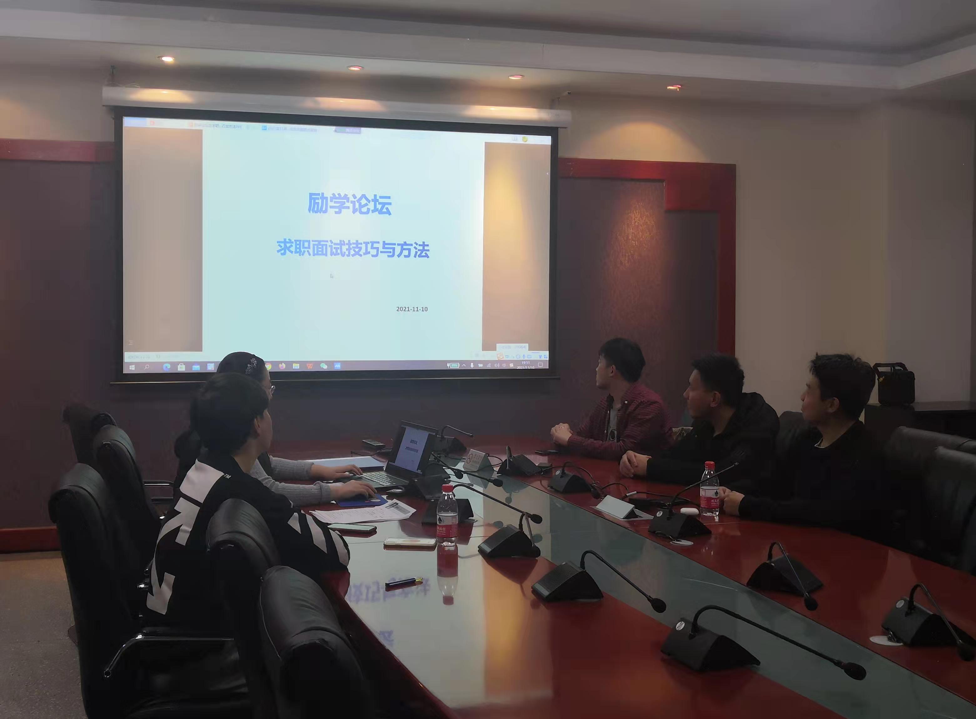 2021年11月10日晚上7:30,pp电子官方网站励学论坛在励学楼201会议室举行。为了帮助会计系毕业生在求职面试环节表现出色,获得用人单位的青睐,得到心仪的职位,本期的主题为“求职面试技巧与方法”,由pp电子官方网站会计系教师兼教师辅导员贾海波老师主讲,2018级会计系准备就业求职的部分学生通过线上和线下的方式参加了本次论坛。