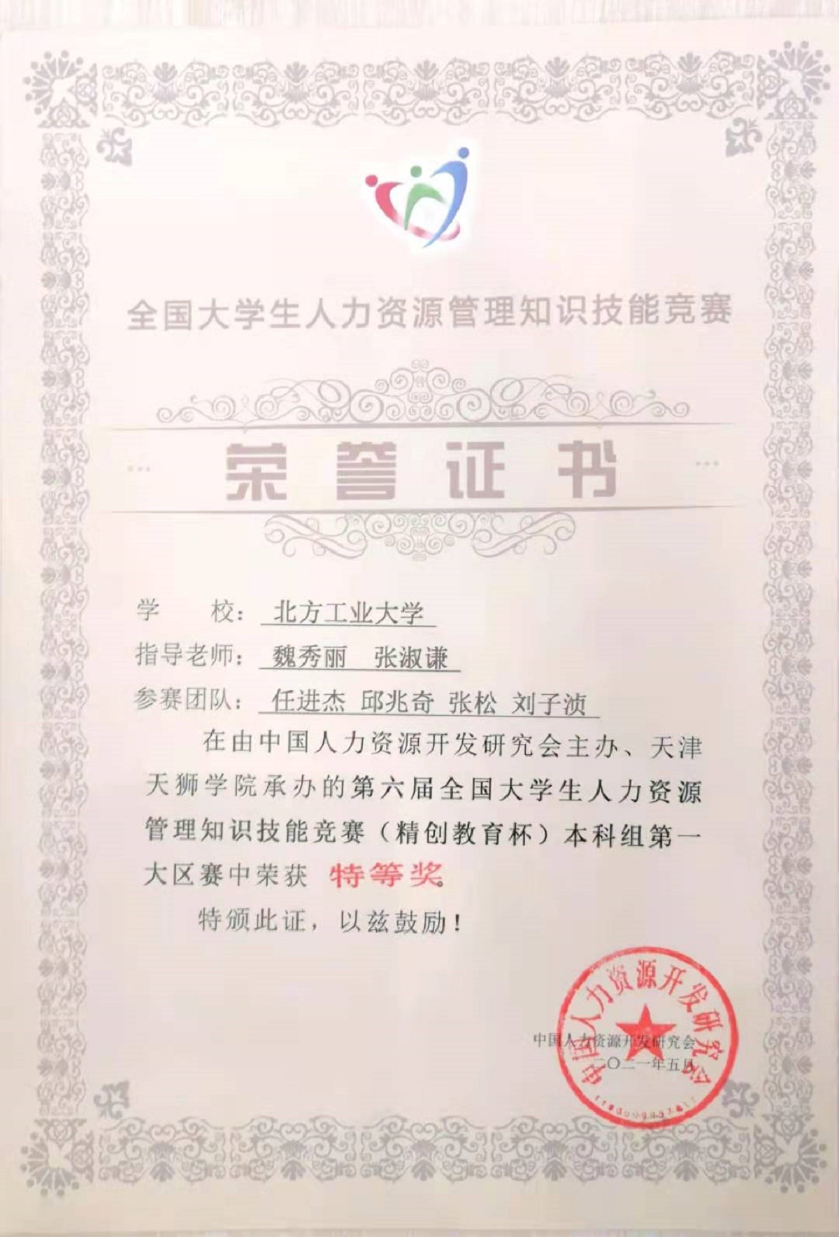 我校pp电子官方网站高度重视此项工作,通过组织全校范围内的选拔赛进行层层选拨,最后工商管理专业2018级的任进杰、邱兆奇、张松、刘子浈4位同学脱颖而出,代表学校参加大区赛,并由工商管理系魏秀丽、张淑谦两位老师全程参与指导。最终,在经过1个小时的理论知识考评和12个小时的人力资源管理智能仿真与竞赛对抗后,pp电子官方网站队在激烈的竞争中以小组第一的成绩获得第一大区赛的特等奖,成功晋级全国总决赛。