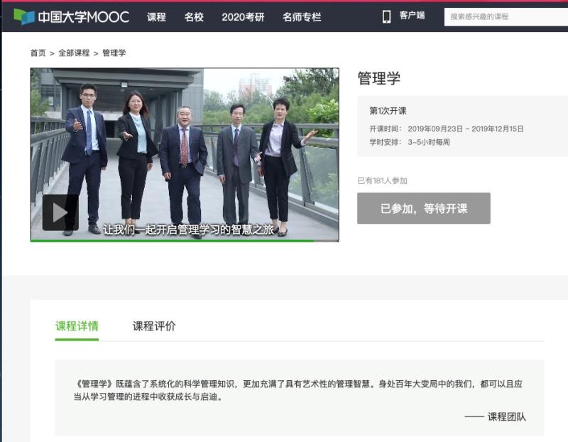 近日,我校《管理学》课程在“中国大学MOOC”平台成功上线,该课程将于9月23日正式开课,是我校首次在国内主流MOOC平台上线管理类的相关MOOC课程。该课程由北京市教学名师、pp电子官方网站院长赵继新教授任课程负责人,郑强国、魏秀丽、罗文豪、张淑谦四位老师任成员。