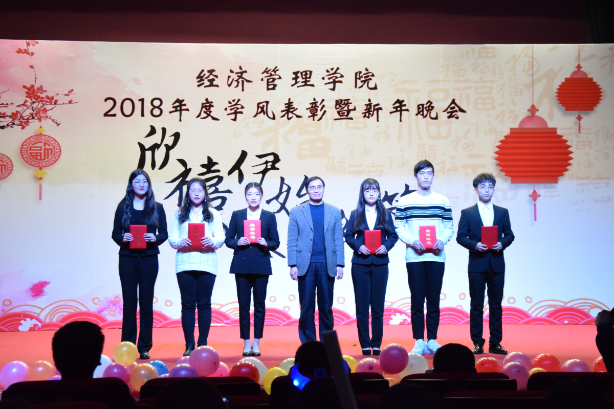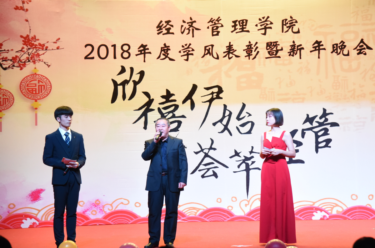 晚会现场,院长赵继新老师向学院全体师生送出了新年寄语,他对大家一年来的表现给予了肯定,表示大家在学校党委的正确领导下,经历了忙碌,也收获了成绩。成绩的取得离不开个人的坚持、更离不开团队的协作。赵老师指出,2018年正值国家改革开放40周年,祖国的快速发展,给我们提供了机遇,更带给我们挑战,他希望同学们都能将个人利益同国家发展相结合,努力成长为栋梁之才,永葆青春活力和热情,发挥“经管人”优良传统,持之不懈、努力拼搏,为国家建设贡献青春力量。