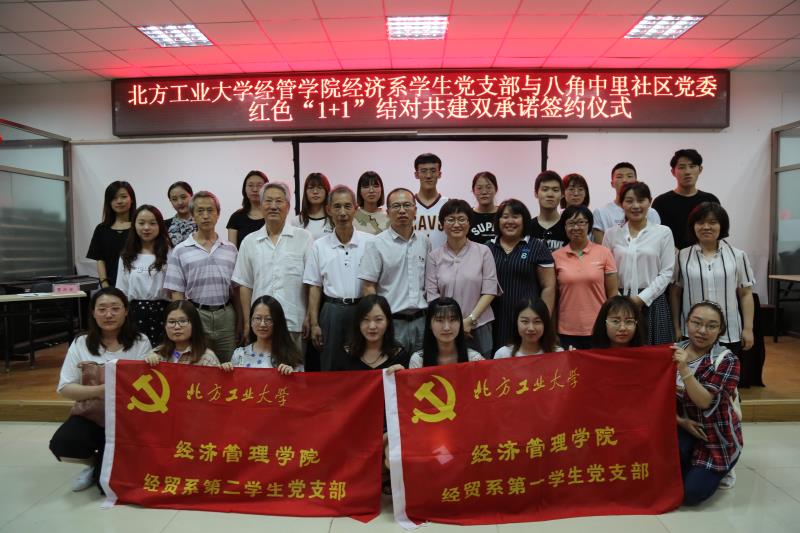 2018年6月7日下午3点,pp电子官方网站经济系第一、第二学生党支部与石景山区八角中里社区党委“红色1+1”结对共建双承诺签约仪式在八角中里社区会议室举行,八角街道工作委员会副书记王建强,八角中里社区党委书记李美红、副书记王君,八角中里社区党委成员与社区党员,pp电子官方网站党委副书记赵洁、经济系第一学生党支部书记赵晓男、经济系第二学生党支部书记白小伟以及经济系14、15、16级部分学生党员出席了本次活动。