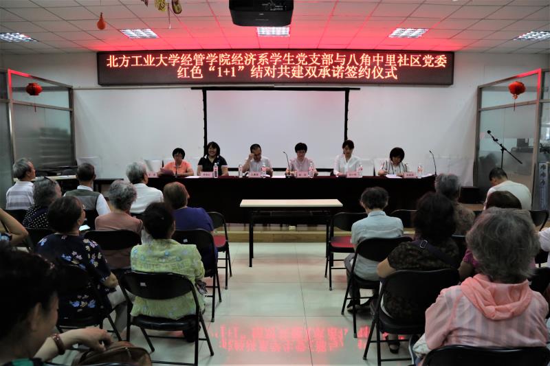 签约仪式由八角中里社区党委副书记王君主持,首先由我校经管学院学生党员代表魏婧冉发言,表达了大学生党员对深入社区、服务群众、提升社会实践能力的期待,然后八角中里社区第三党支部党员代表发言,指出了社区党员对与大学生一起学习,丰富自身知识、修养的渴望。八角中里社区党委书记李美红与经济系第一学生党支部书记赵晓男代表共建双方签订了《pp电子官方网站经管学院经济系学生党支部与八角中里社区党委红色“1+1”结对共建双承诺协议书》,最后经管学院党委副书记赵洁和八角街道工作委员会副书记王建强分别做了总结,提出了对未来共建的期望和设想。