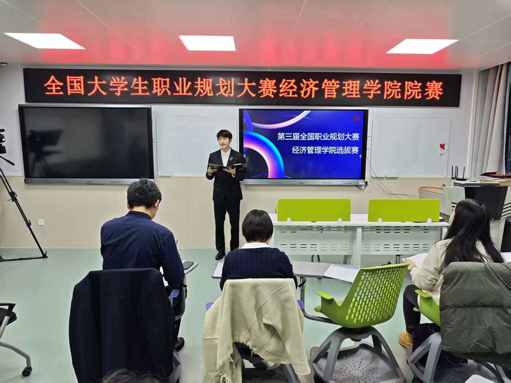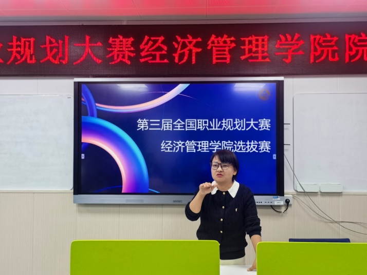 在院内选拔赛前,12名选手借助学院自主设计和主导研发的大学生职业生涯虚拟仿真实训平台进行了职业测评和自我定位。在比赛中,选手们系统剖析个人核心优势与发展潜力,聚焦职业规划落地路径,详细阐述了个人在学科探索、项目参与、行业志愿活动等方面的实践行动,同步分享了职业目标设定和成长过程中的阶段性成果与反思。很多同学还围绕“人工智能+”等当今科技创新与产业创新深度融合的技术能力需求进行了职业优化,体现了新时代大学生关注政策导向、技术趋势和市场需求的新面貌。评委老师们针对每位同学的汇报提出了针对性的问题和建议,帮助同学们梳理自己的成长和就业路径,发现在职业生涯规划上的改进方向,让参赛选手们受益匪浅。