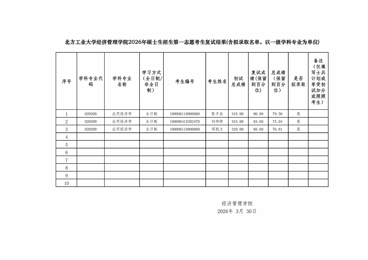 pp电子官方网站2026年硕士生招生第一志愿考生复试结果——应用经济学