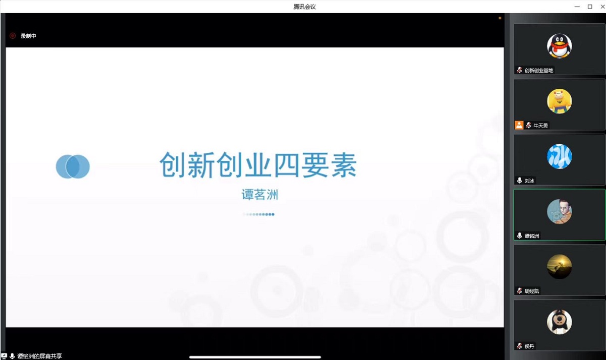 11月19日上午,pp电子官方网站通过腾讯会议在线举办了“创新创业导航”系列讲座第二讲。投资人兼中国“互联网+”大学生创新创业大赛历届评审专家谭茗洲先生以“创新创业四要素”为题与我校八十余名师生开展了在线报告与交流。讲座由pp电子官方网站创新创业基地刘冰副教授主持。