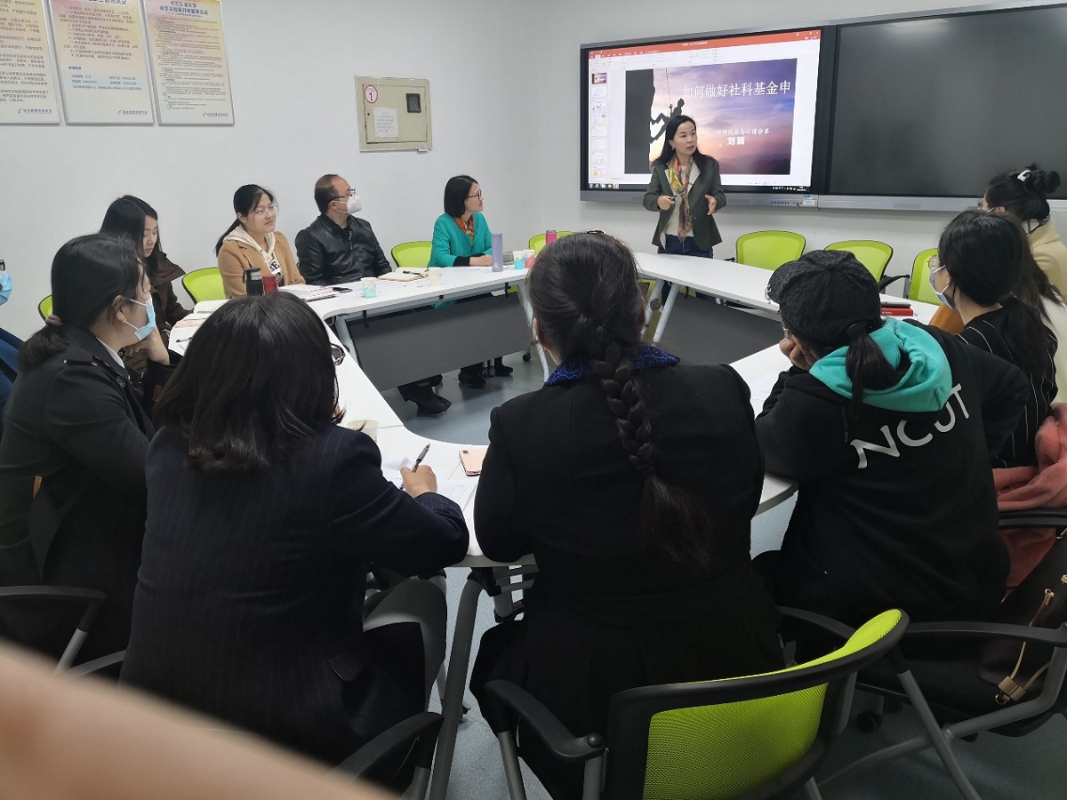 刘颖教授以自身课题申请的心路历程和对如何做好课题选题及申报工作与老师们进行深入交流。首先,她就自己五次申请国家社科基金课题,三次成功的真实经历和感悟,鼓励老师们拒绝躺平,积极参与到科研工作中,不断提升自己。其次,她告诫青年教师,外界力量虽然重要,但更重要的是自己沉下心来,进入研究状态,深入思考,明晰思路。然后,从选题如何选,文献综述如何梳理,逻辑自洽性如何形成,申请书怎么写,详细分享社科课题申报环节需要注重的要点。最后,她从评审专家的视角对青年教师的选题和研究思路进行了点评,与青年教师对话交流。