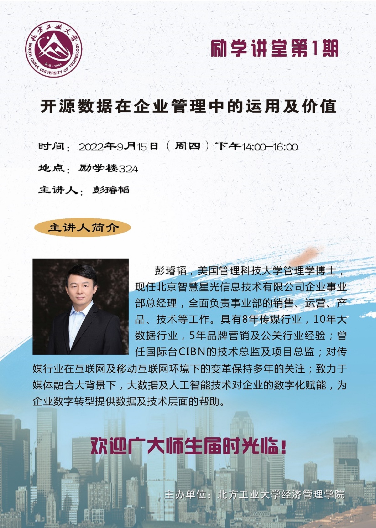 为有效促进研究生学术交流活动的开展,活跃学术研究氛围,搭建学术爱好者的思想交流平台,9月15日下午,pp电子官方网站在励学楼324举行第一期励学讲堂活动。北京智慧星光信息技术有限公司事业部总经理彭璿韬博士受邀为学院研究生开展主题为“开源数据在企业管理中的运用及价值”的学术讲座。学院副院长蒋贵凰教授主持讲座。