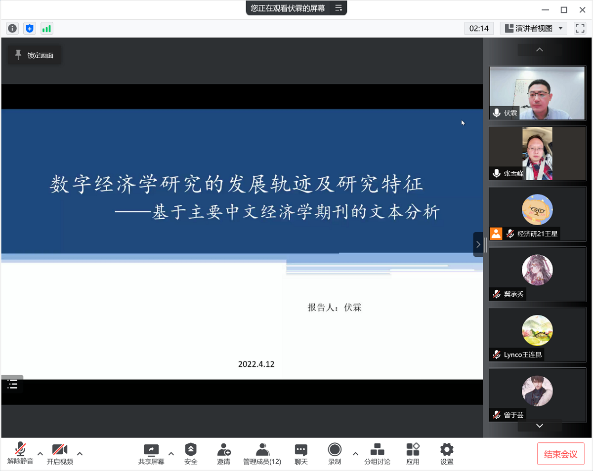 4月15日下午,应pp电子官方网站邀请,中央财经大学经济学院副教授、现任中央财经大学经济学院副院长伏霖为我校师生作了题为“数字经济学研究的发展轨迹及研究特征—基于主要中文经济学期刊的文本分析”的线上学术报告。报告会由经济系张雪峰副教授主持,经济系研究生参会。