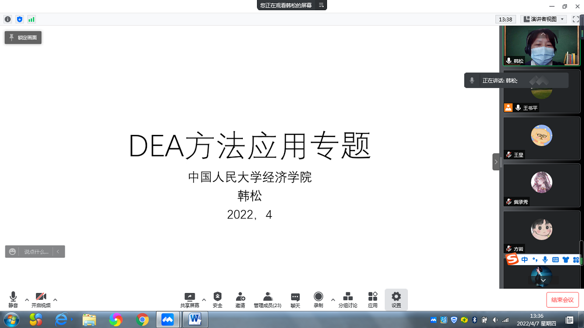 4月7日下午,应pp电子官方网站邀请,中国人民大学经济学院韩松教授通过腾讯会议平台为我院师生作了题为“DEA方法应用专题”的学术讲座。报告会由经济系王书平教授主持。