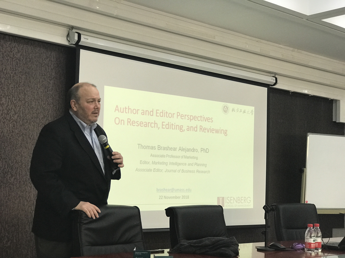 2018年11月22日下午,应pp电子官方网站邀请,Journal of Business Research(SSCI期刊)副主编、Marketing Intelligence & Planning(SSCI期刊)主编托马斯•布拉希尔(Thomas Brashear)教授在励学楼301会议室为我校师生作了题为《研究、写作与评审:作者和主编的视角》的学术报告。pp电子官方网站部分教师及研究生代表参加了此次报告会,报告会由李晨光博士主持。