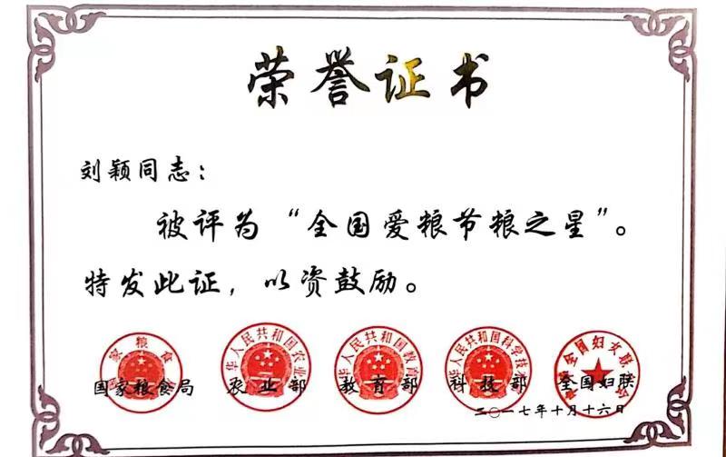 刘颖-国家粮食局颁发“全国爱粮节粮之星” |