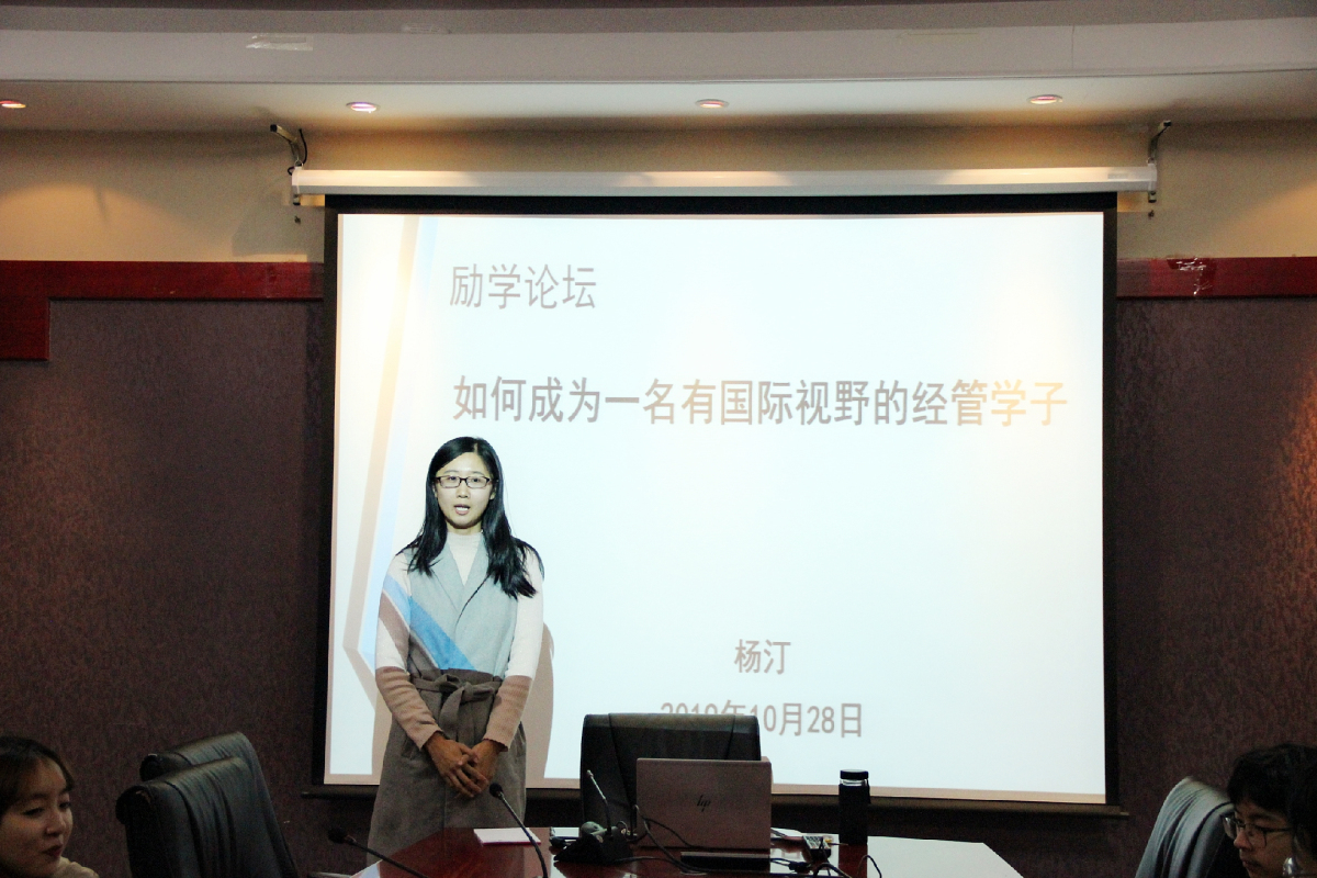 10月28日晚,pp电子官方网站励学论坛在励学楼201会议室举行。本期论坛主题为“如何成为一名有国际视野的经管学子”。本次论坛由教师辅导员杨汀老师主讲,青创部协办,19级国际班有出国深造意向的同学参加了此次论坛。