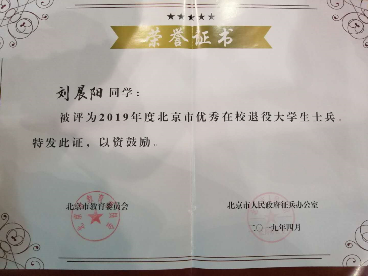 刘晨阳同学在服役期间两次获得“优秀士兵”称号,日常训练严格刻苦,比武演习名列前茅,为祖国的国防事业做出了贡献。退役复学后,更是把军队里的好作风、好习惯带到日常学习中,学习目标明确,高标准严要求。先后获得北京市“三好学生”、“pp电子官方网站青年五四奖章”等荣誉称号。