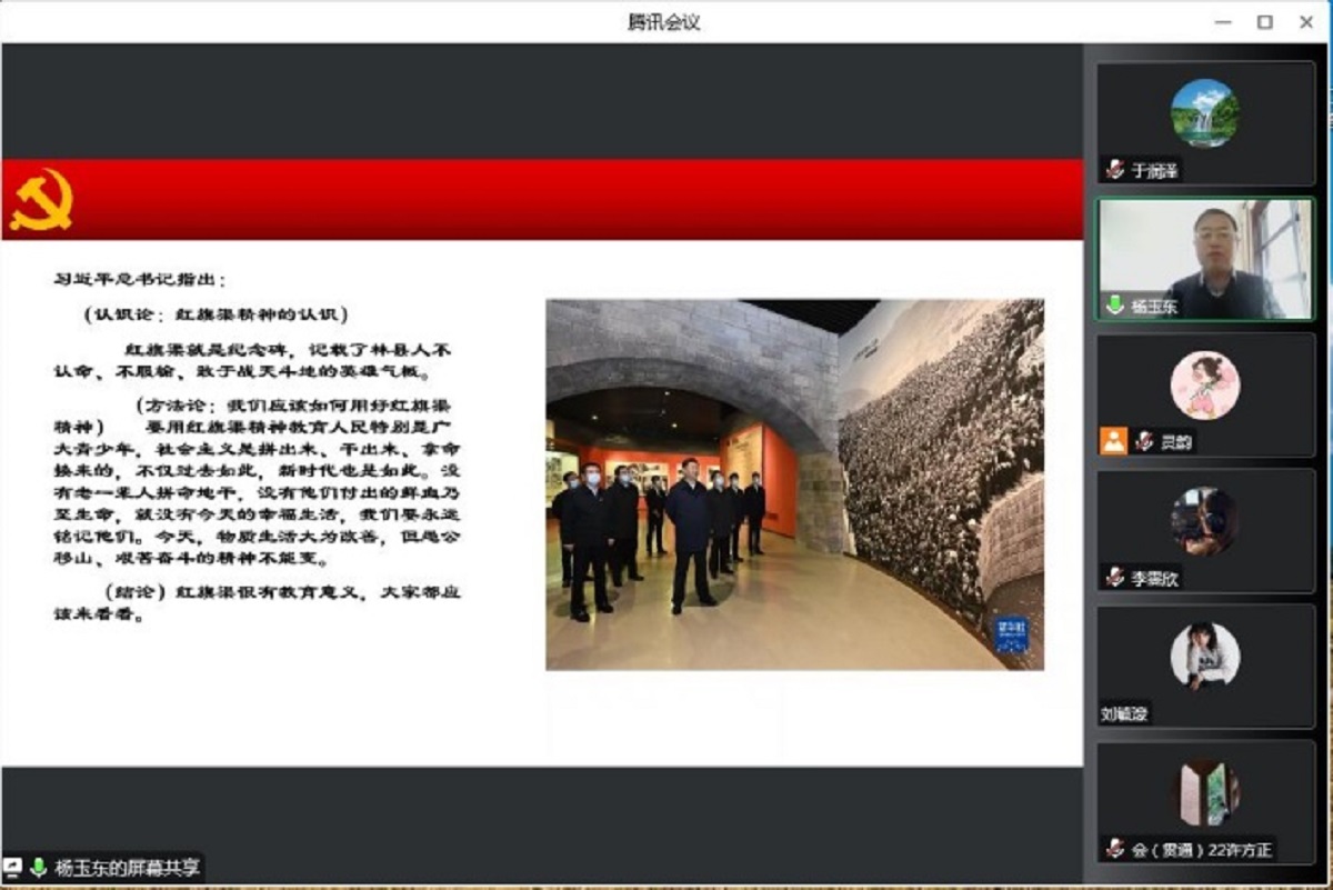 为深入学习贯彻习近平新时代中国特色社会主义思想和党的二十大精神,深入学习红旗渠精神,强化学院党员理论水平,12月1日,pp电子官方网站邀请河南省安阳市林州市委宣传部副部长杨玉东同志讲授红旗渠精神专题党课。学院全体师生党员通过腾讯会议线上进行党课学习,会议由学院党委副书记王帏主持。