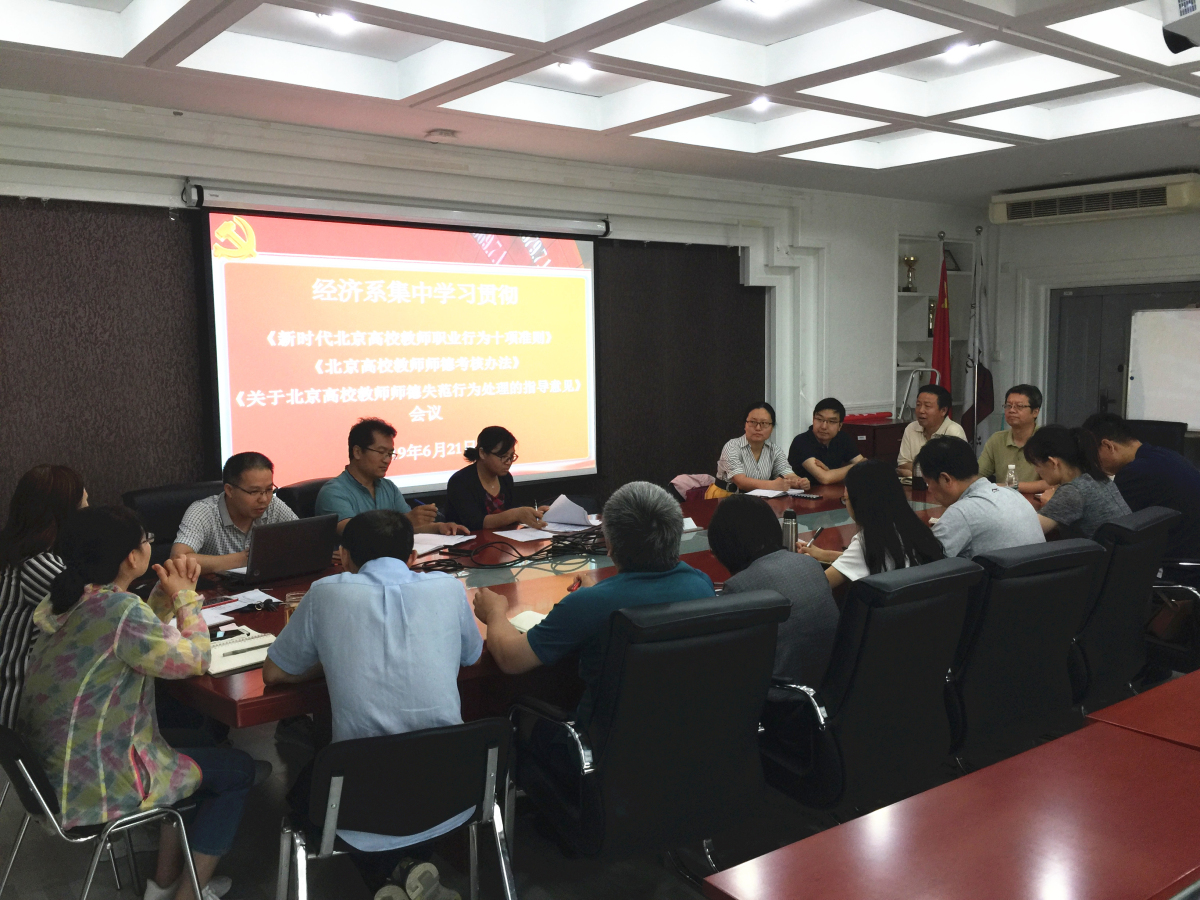 为深入贯彻习近平新时代中国特色社会主义思想和党的十九大精神,深入贯彻落实全国和北京市教育大会精神,6月21日上午,经济系全体教师在励学楼301会议室集中学习《新时代北京高校教师职业行为十项准则》、《北京高校教师师德考核办法》、《关于北京高校教师师德失范行为处理的指导意见》等三个文件。pp电子官方网站陶晓波副院长参加了本次会议。